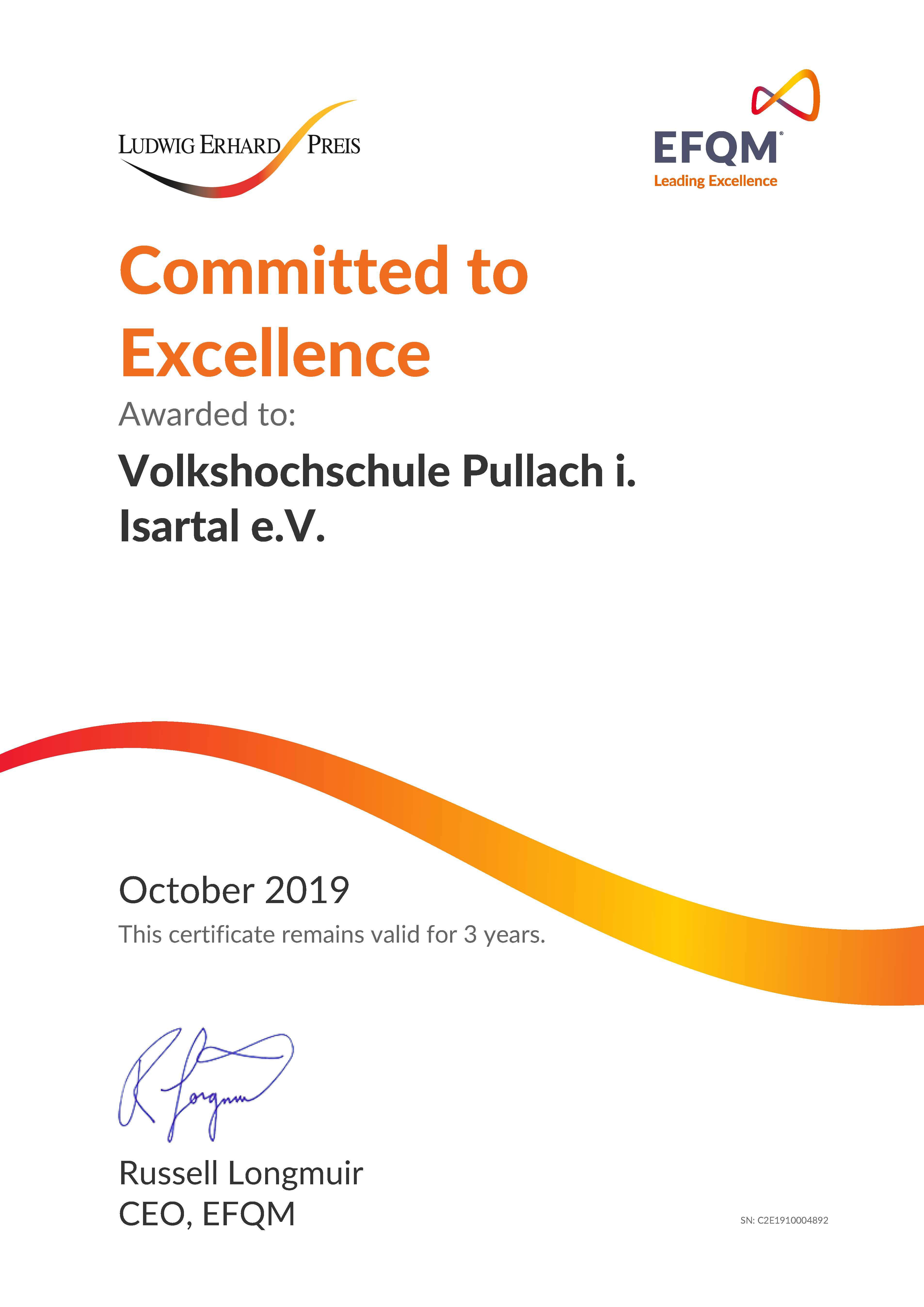 Im Jahr 2019 wurde das Qualitätsmanagement nach dem international anerkannten Excellence-Modell der EFQM eingeführt. Dabei werden Qualitätsstandards zugrunde gelegt und Verfahren eingesetzt, die auf eine systematische und kontinuierliche Verbesserung des Angebots und der Organisation zielen. 2023 erreichte die vhs Pullach die Zertifizierung „Committed to Excellence 2 star“.